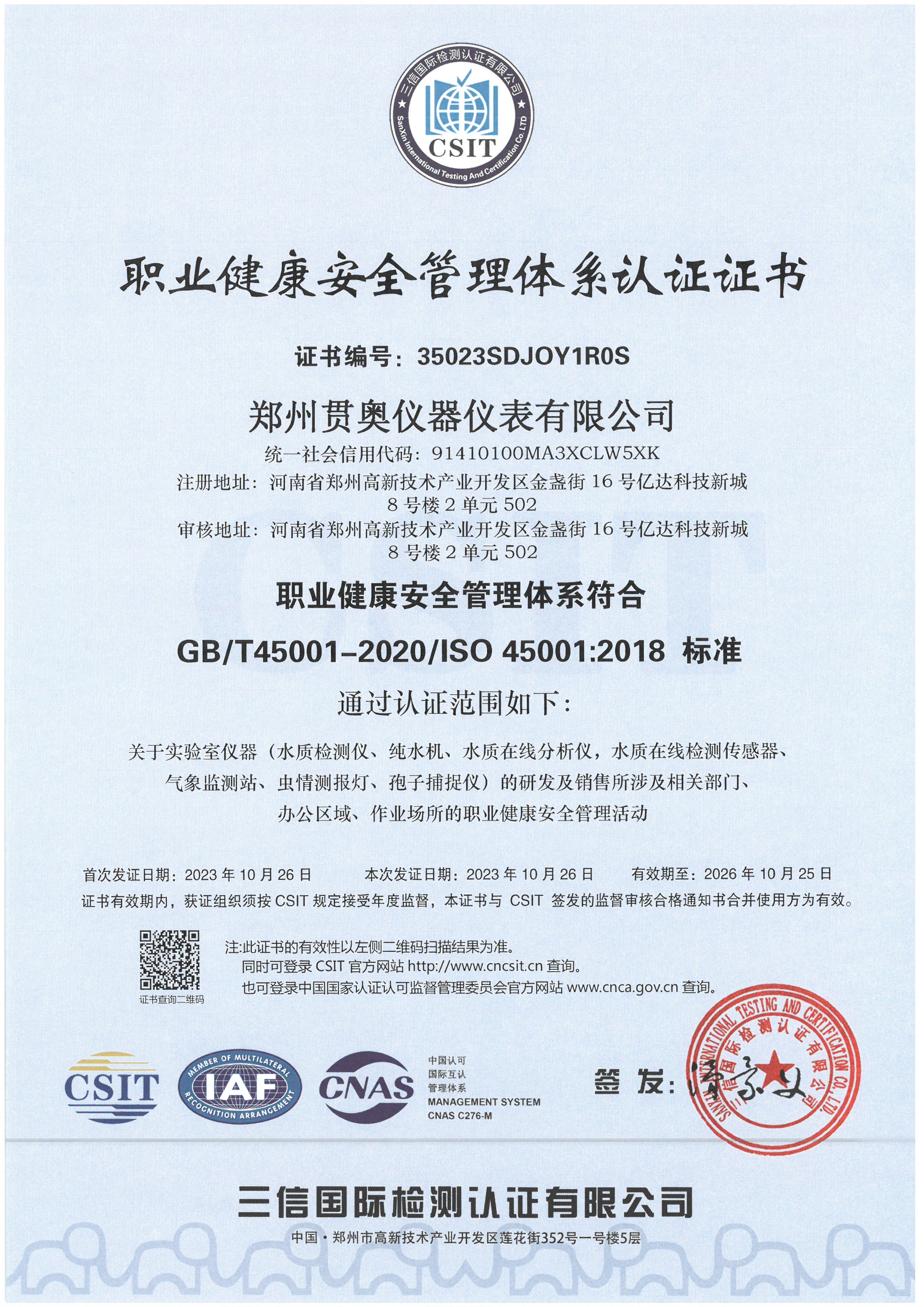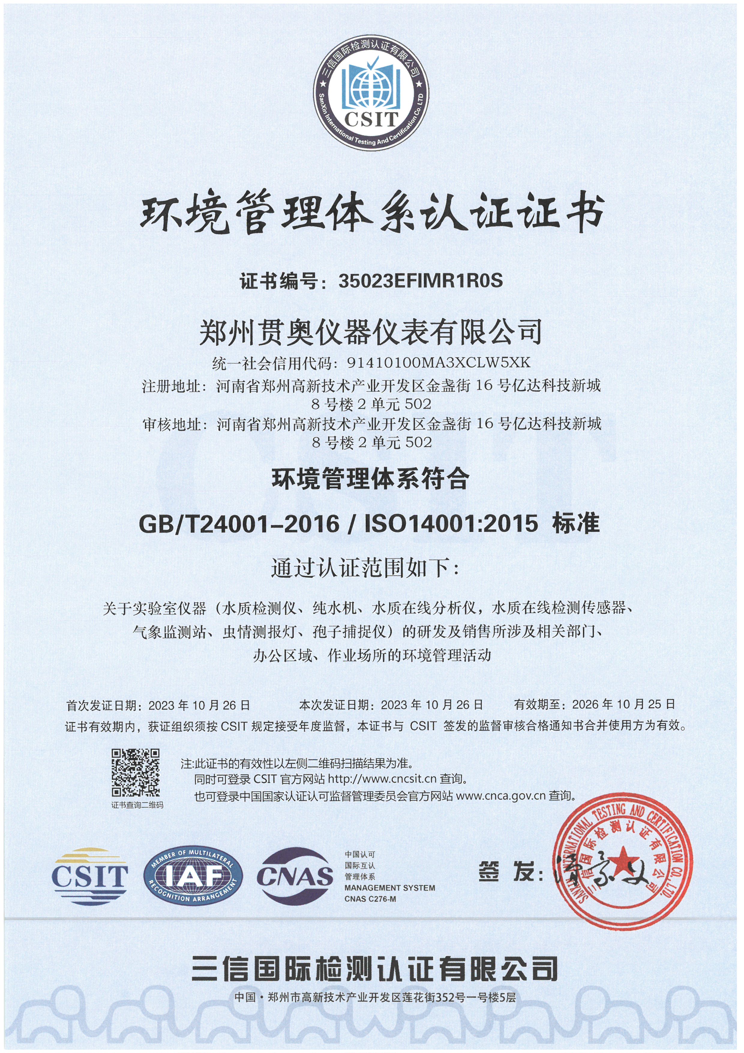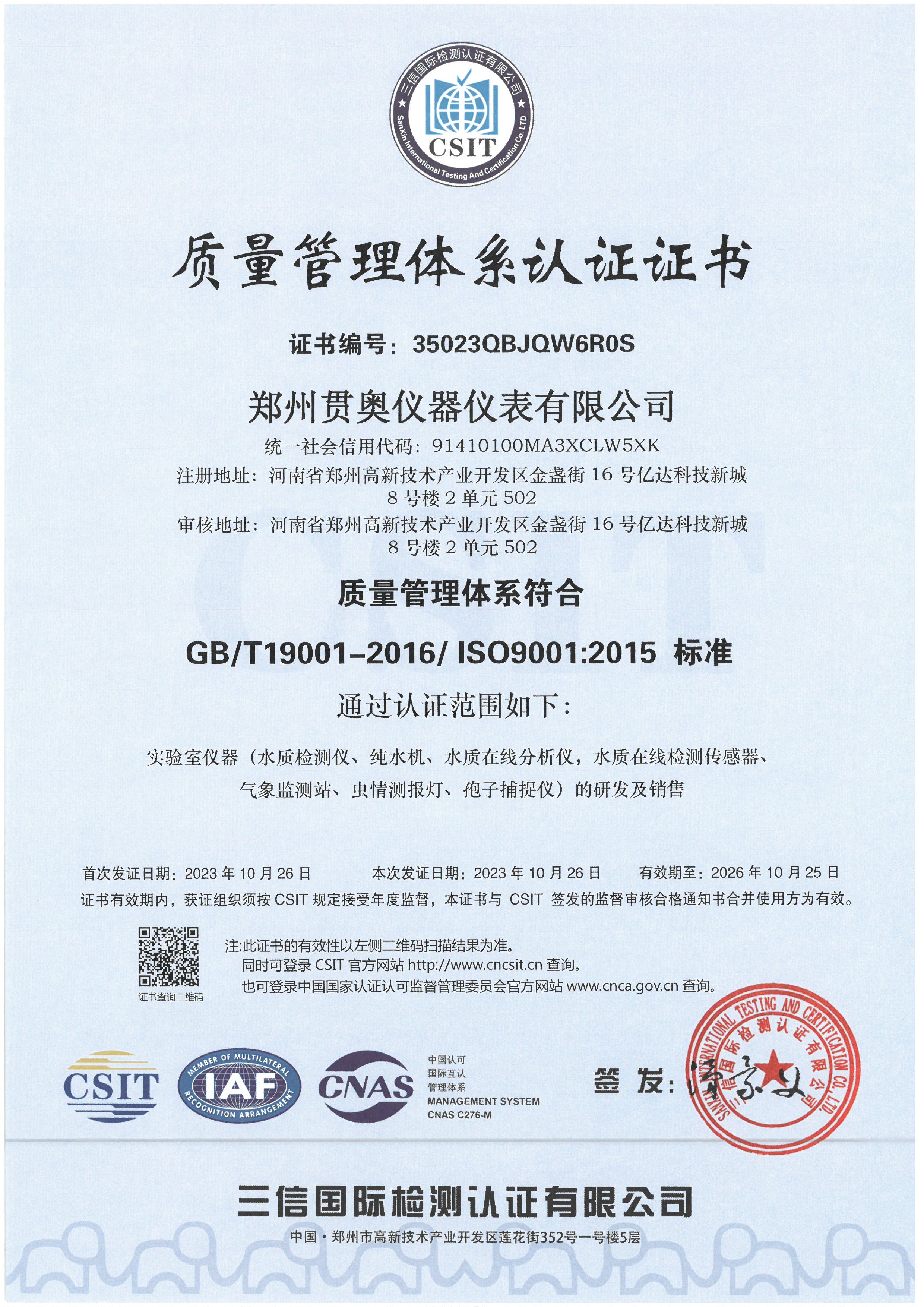 貫奧儀器位于鄭州高新技術(shù)產(chǎn)業(yè)開(kāi)發(fā)區(qū),是高新技術(shù)企業(yè)、行業(yè)AAA級(jí)信用企業(yè),已通過(guò)GB/T19001:2016質(zhì)量管理體系認(rèn)證、GB/T24001:2016環(huán)境管理體系認(rèn)證和GB/T45001:2020職業(yè)健康安全管理體系認(rèn)證,擁有多項(xiàng)證書(shū),產(chǎn)品已通過(guò)河南省電子信息產(chǎn)品質(zhì)量監(jiān)督檢驗(yàn)院檢測(cè),并出具了相關(guān)檢驗(yàn)報(bào)告,我們以雄厚的研發(fā)實(shí)力、過(guò)硬的產(chǎn)品質(zhì)量、完善的售后服務(wù)為客戶提供分析檢測(cè)技術(shù)解決方案,擁有過(guò)硬的分析儀器生產(chǎn)技術(shù)和整體的水質(zhì)監(jiān)測(cè)解決方案。