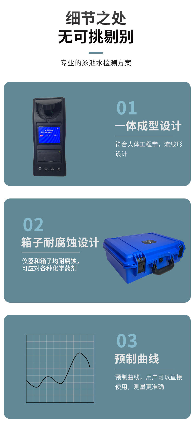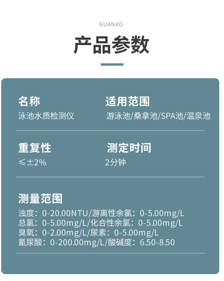 1、相比于傳統(tǒng)的試劑試紙測定,貫奧泳池水質(zhì)檢測箱的檢測數(shù)據(jù)更準確,檢測速度更快。