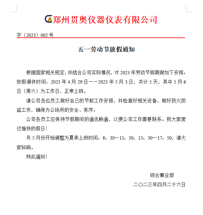 根據國家相關規定,并結合公司實際情況,對2023年勞動節假期做如下安排: