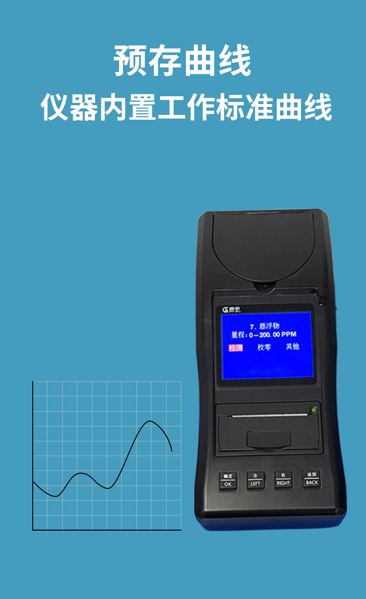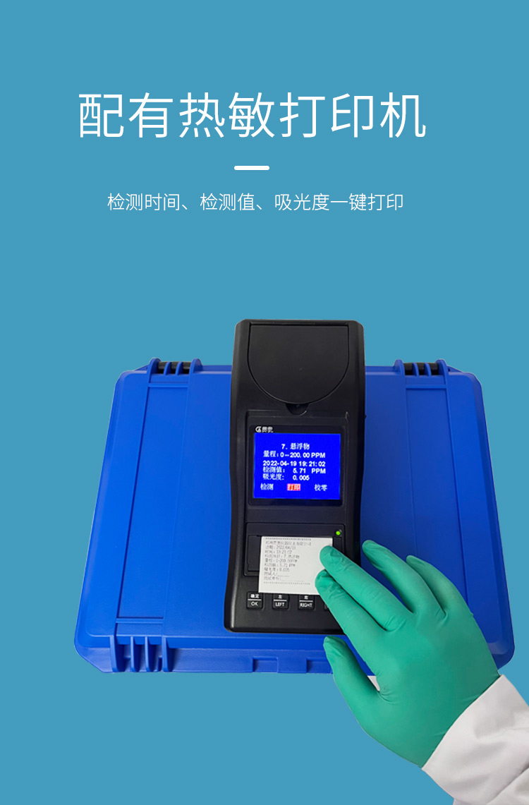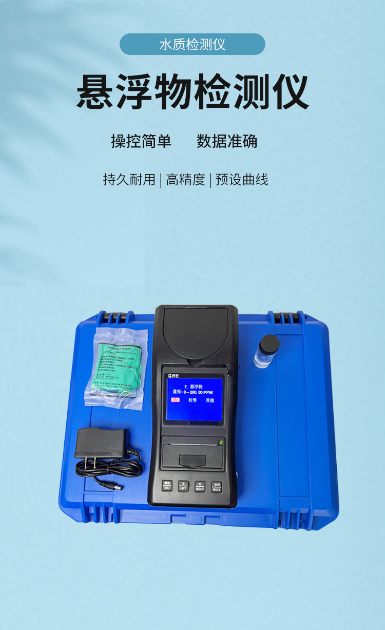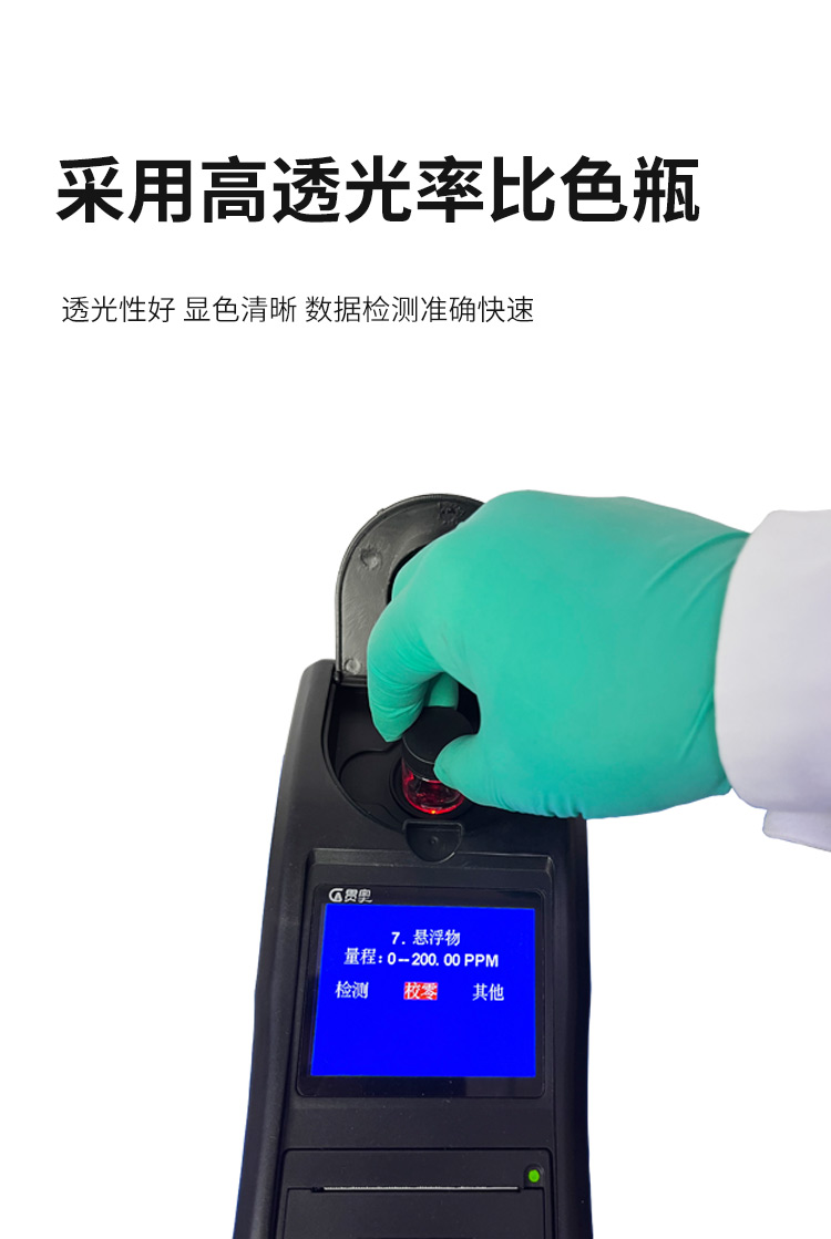 懸浮物水質檢測儀可快速準確測定地表水、地下水、城市污水及工業廢水中懸浮物指標,濃度直讀;可廣泛用于水廠、食品、化工、冶金、環保及制藥行業等部門。儀器是由單個的固定波長固定用途的分光光度計糅合而成的,采用分光光度法原理對各參數進行測量,在儀器中建立不同參數的濃度顯色程度與吸光度的線性曲線,儀器通過對顏色的辨別,得出被測水樣的濃度。本儀器采用全中文菜單,操作簡單易懂,使用方便快速測量準確度高。